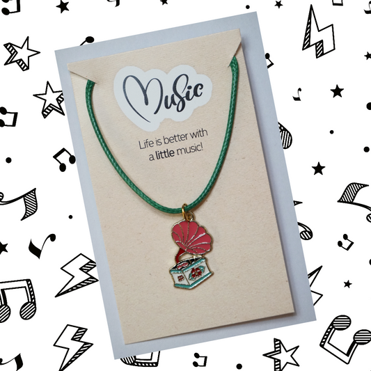 Life Is Better With A Little Music Necklace - Vintage Gramophone (Green Cord)