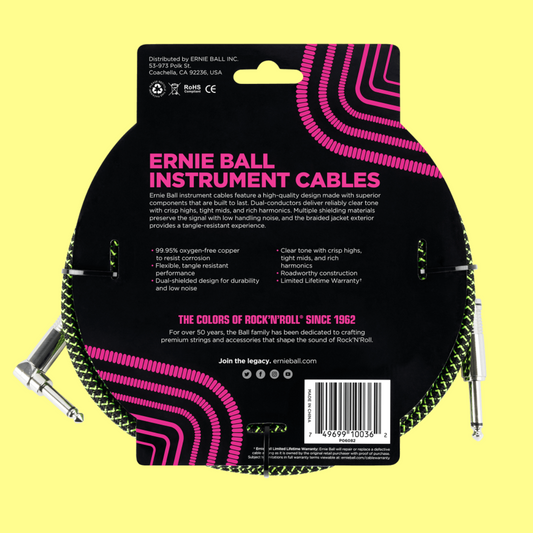 Ernie Ball 5.5 Metre Braided Straight / Angle Instrument Cable (Black/Green)