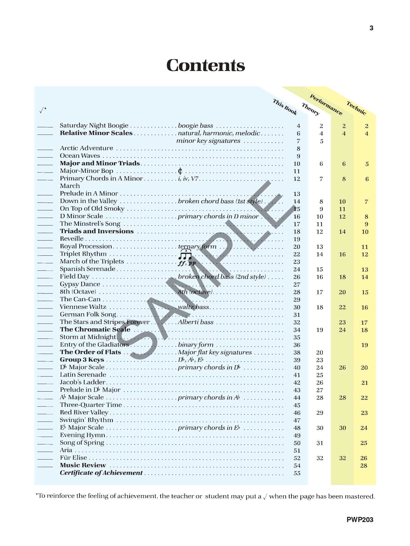 Level 3 presents relative minor scales (a and d), octaves, minor key signatures, major-minor triads, primary chords in minor, various bass styles, triplets, the chromatic scale, and the keys of D-flat, A-flat, and E-flat.