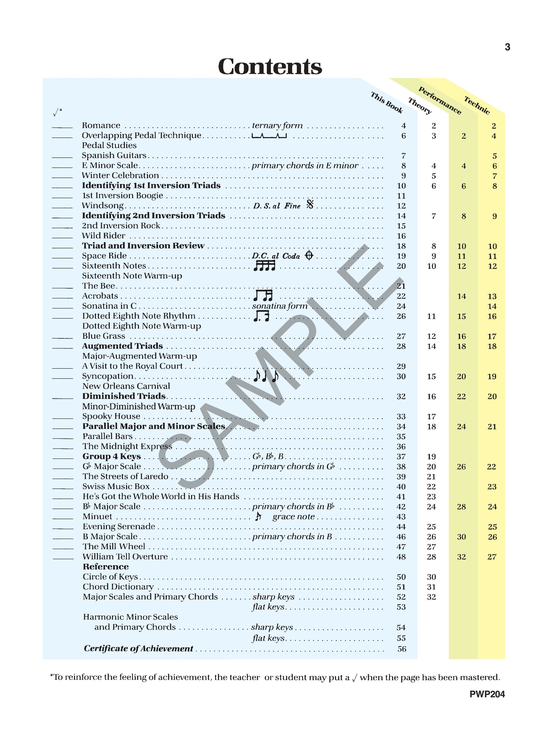 Level 4 presents the overlapping pedal, 1st and 2nd inversion triads, sixteenth notes, dotted eigth notes, altered intervals, augmented and diminished triads, syncopation, parallel major and minor scales, grace notes, and the keys of G-flat, B-flat, and B.