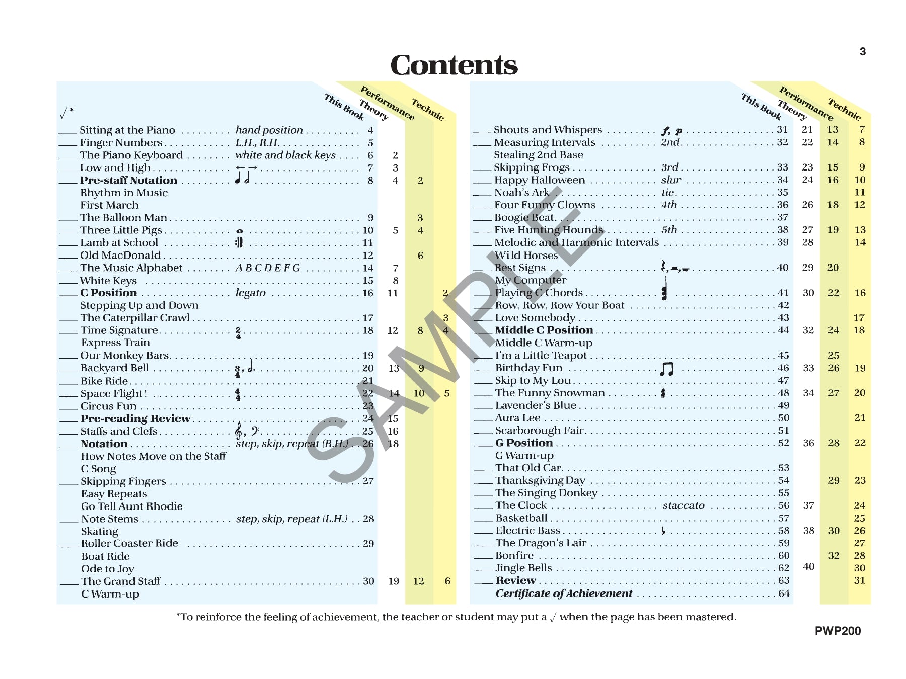 The Primer Level is for average age beginners (7-11). It uses pre-staff notation before introducing the grand staff. Reading is presented with steps, skips, and repeated notes. Music includes a variety of original works, folk songs, and pop styles, many with duet accompaniments.