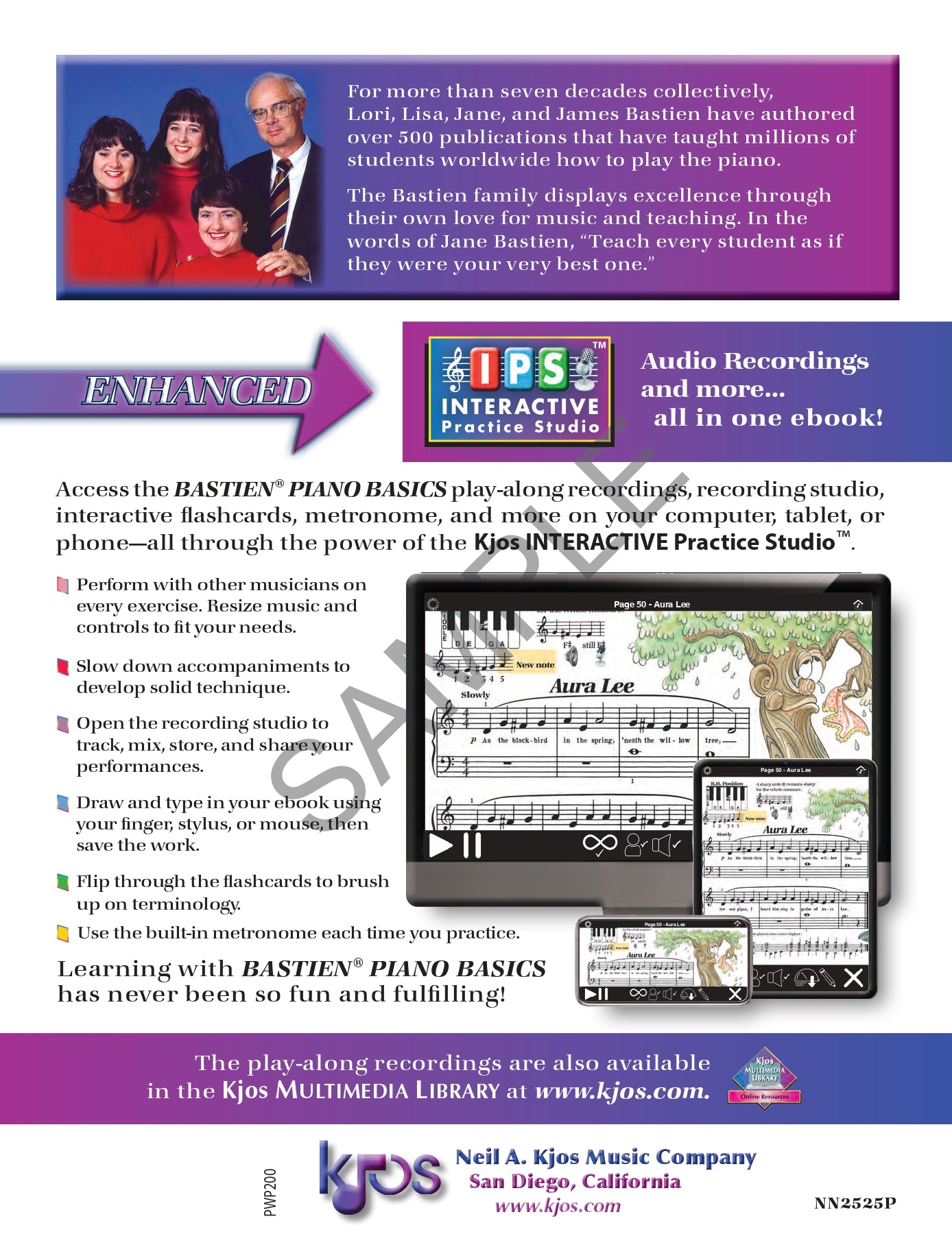 Bastien Piano Basics ENHANCED editions combine the time-tested, best-selling Bastien Basics pedagogy with innovative technology to take learning to a whole new level! Each book includes online access, new play-along accompaniments, a personal recording studio, writing tools, flashcards, and much more – all powered by the INTERACTIVE Practice Studio (IPS) app!