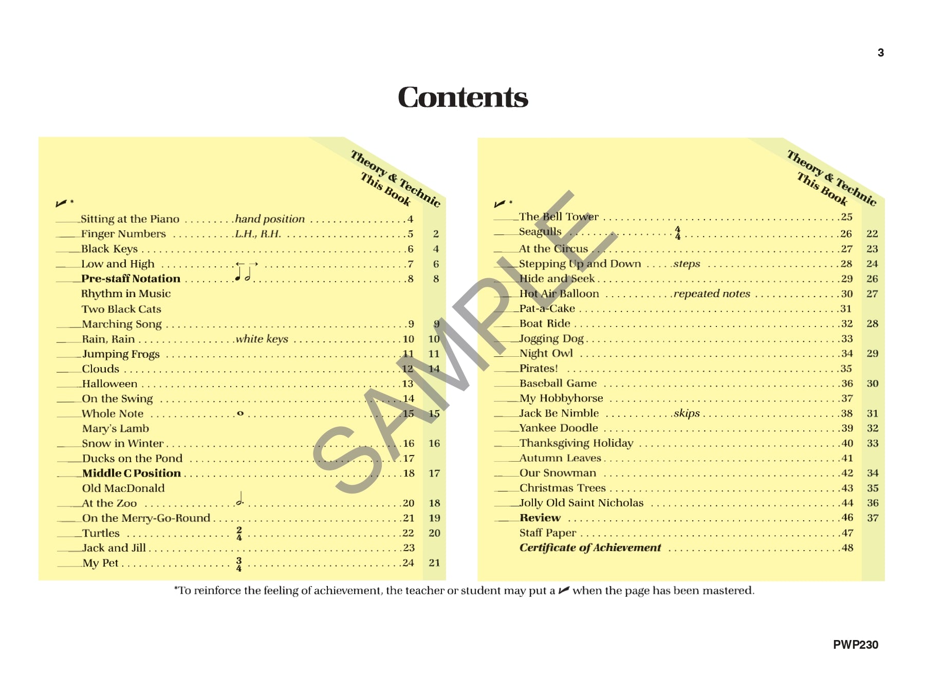 Primer A is for beginners ages 5-6; traditional middle C approach begins with pre-staff notation; grand staff is introduced on page 28.