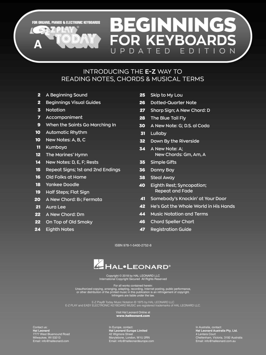 Embark on your musical journey with Beginnings for Keyboards - EZ Play Piano Book A (Updated Edition). This introductory folio is designed to get you started on the keys and introduces you to the patented Hal Leonard E-Z Play notation, making it easy to read notes, chords, and musical terms.