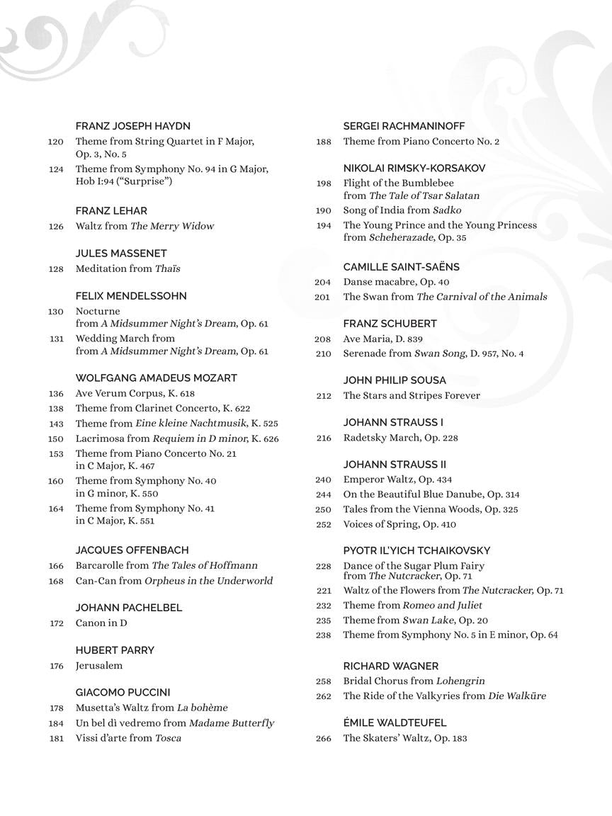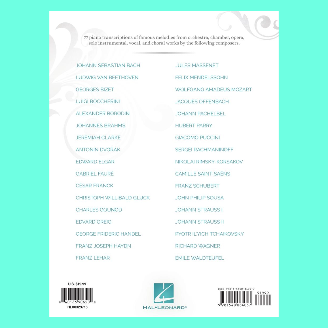 This expansive collection brings together 77 beloved classical piano solo arrangements, perfect for intermediate pianists. Featuring works from 34 renowned composers, the book includes timeless pieces such as Bach's "Air on the G String" and "Toccata and Fugue," Beethoven's themes from "Symphony No. 5" and the "Emperor" Piano Concerto, Bizet's "Habanera" from *Carmen*, and many more.