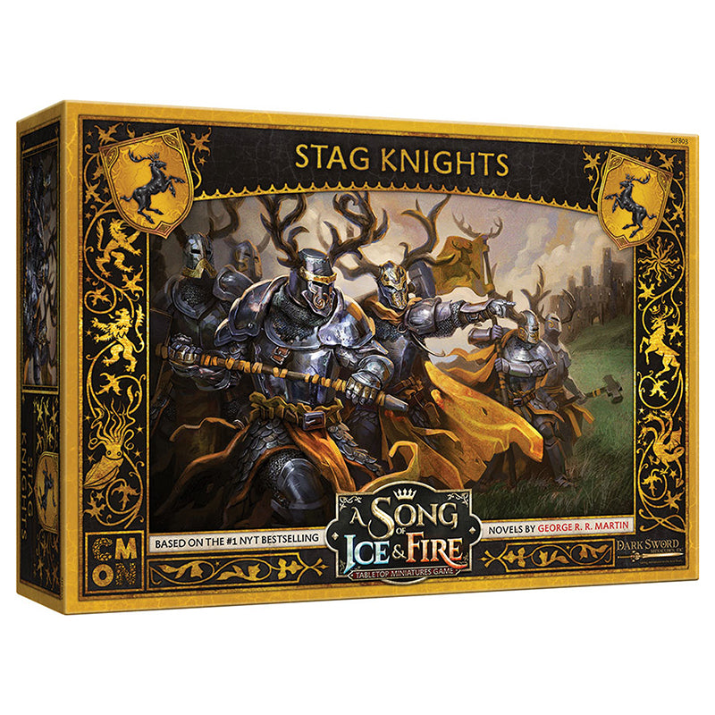 The Stag Knights unit box for the A Song of Ice and Fire: Tabletop Miniatures Game gives House Baratheon commanders a strong, tough, elite unit for their forces. Clad in heavy armor, letting them take a significant blow from the enemy and coming out fine, as the unit does take damage, it only grows stronger. As ranks are destroyed, the unit gains access to several special abilities, each one as deadly as the last.