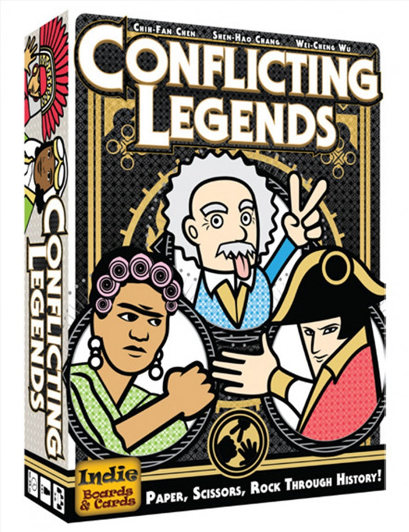 In Conflicting Legends, players may conquer new lands with their forces or develop the lands with culture or technology to gain glory points. Whoever conquers all six continents or wins ten or more glory points will be declared the winner. The key to victory is to attack opponents lands and resolve the conflict by casting Rock-Paper-Scissors. With the special abilities of various great people in the history, RPS has never been so much fun!
