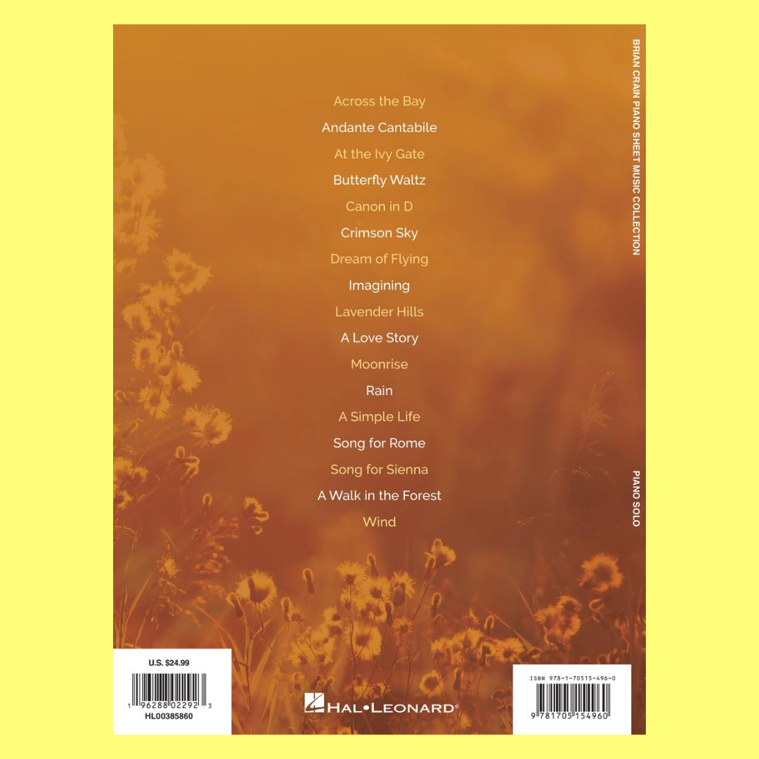 The Brian Crain - Piano Sheet Music Collection features 17 beautiful solo piano pieces by renowned contemporary composer Brian Crain. This 80-page book includes soothing favourites like Canon in D, Butterfly Waltz, and A Love Story, offering pianists a chance to play Crain’s elegant and calming compositions. Perfect for those who appreciate Crain's emotive and serene style, this collection is ideal for relaxation, practice, or performance.