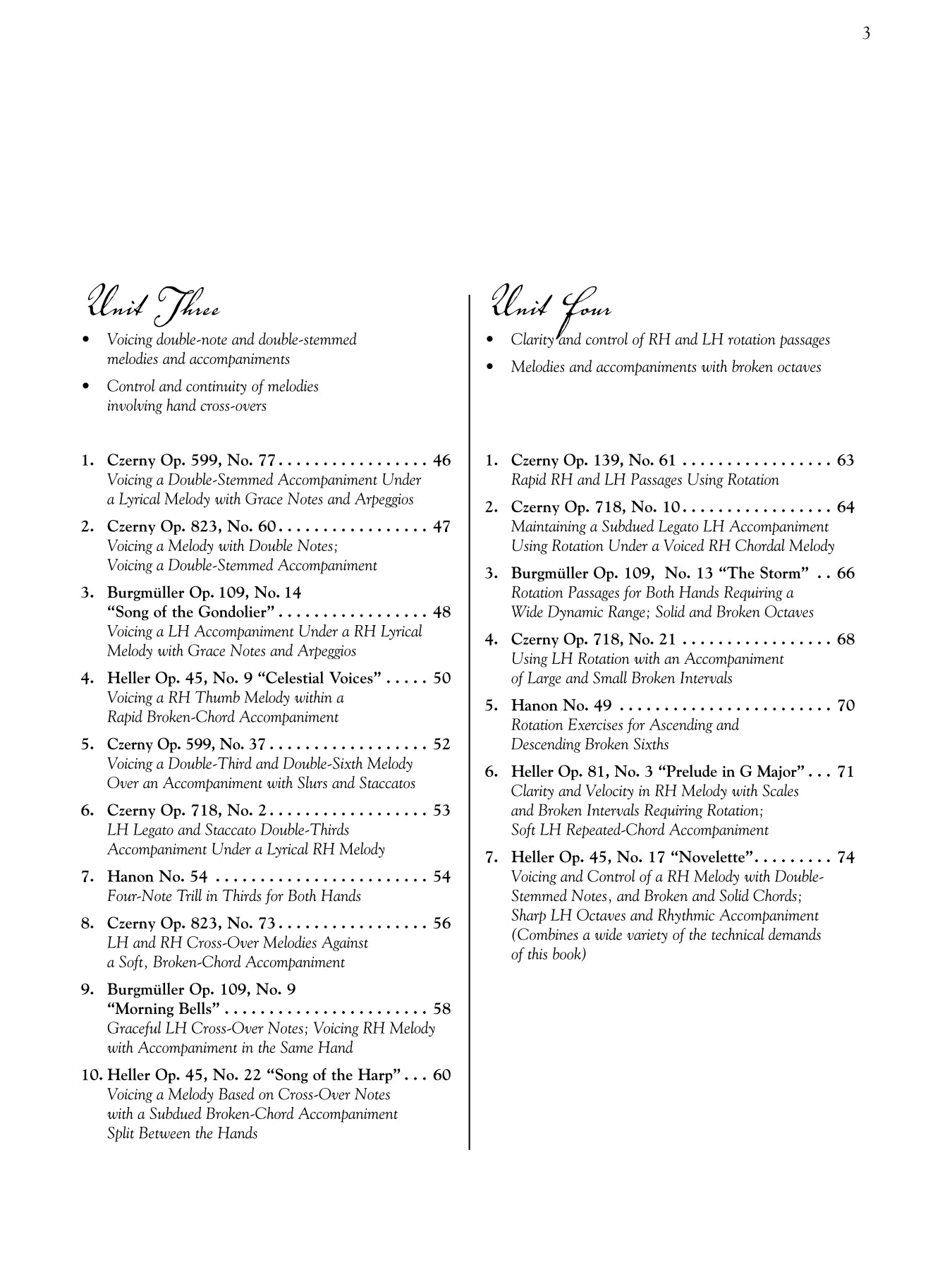 Book 3 presents a collection of engaging musical etudes by Carl Czerny, Johann F. Burgmuller, Stephen Heller, and select exercises by Charles-Louis Hanon. Designed to develop both technique and musicality, the studies are grouped into four units, each emphasizing specific skills.