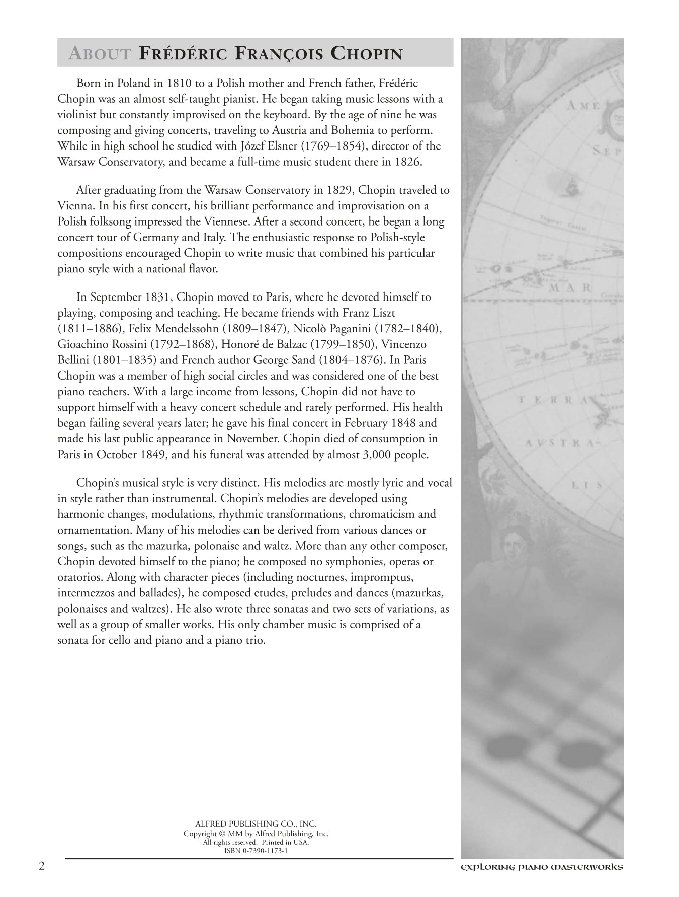 This Exploring Piano Masterworks edition introduces late intermediate to early advanced pianists to four of Chopin's most beloved nocturnes. This series is designed to help students with experience playing standard piano literature dive deeper into masterworks by a variety of composers.