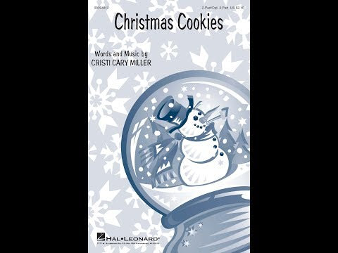 The Christmas choral sheet music titled "Christmas Cookies" by composer Cristi Cary Miller is arranged in a 2-part format, with an optional 3rd part for treble choirs. It's presented in octavo format.