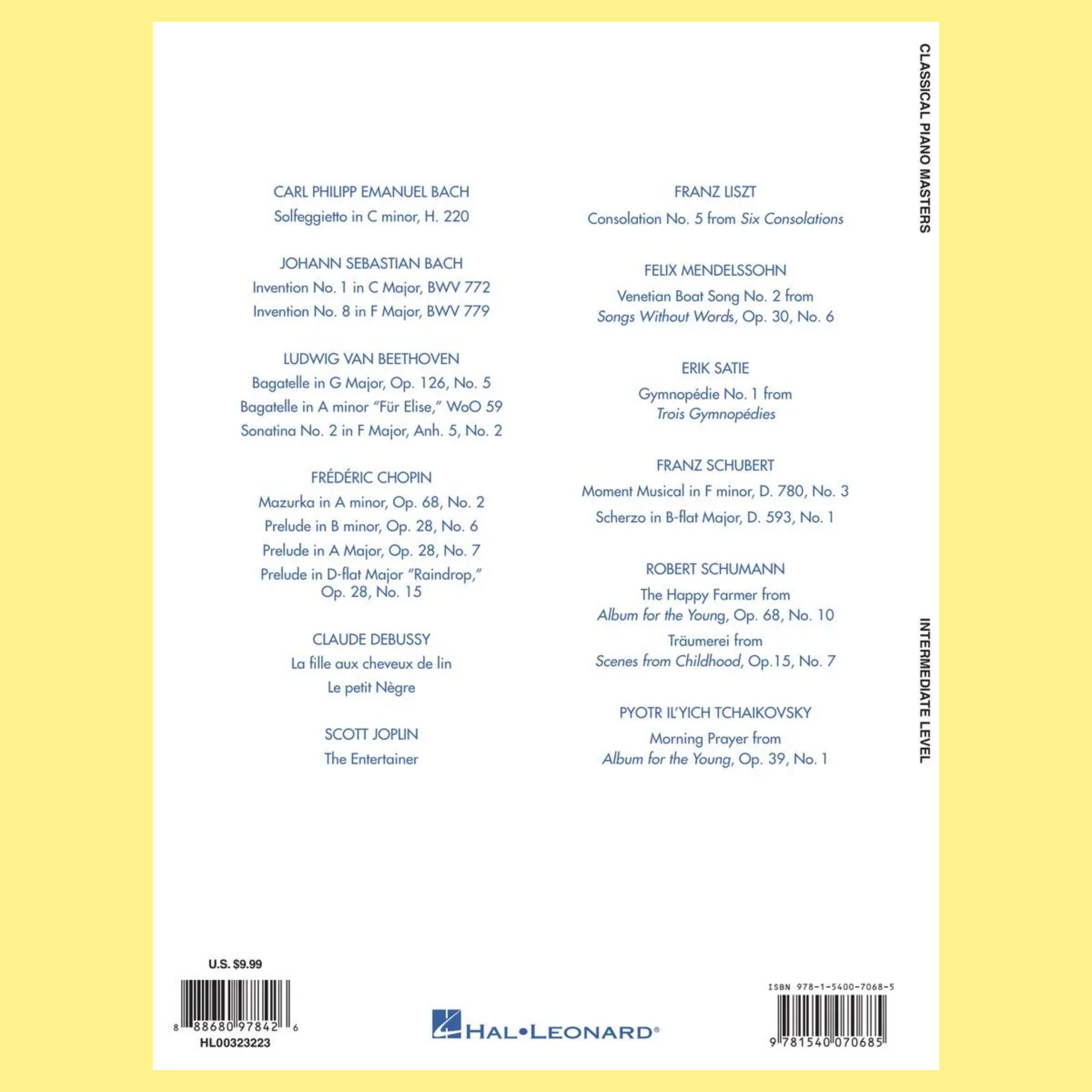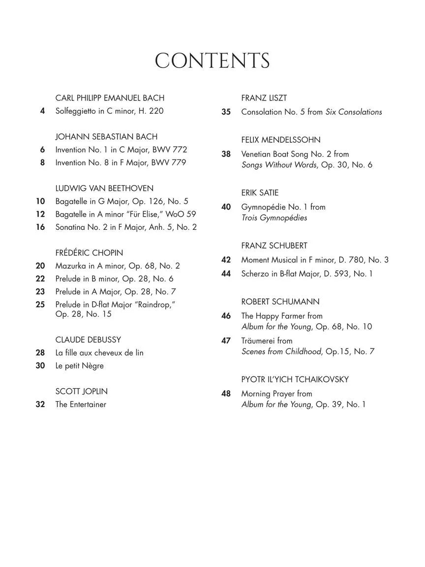 Classical Piano Masters Intermediate Level features 20 carefully selected pieces from 12 of the greatest composers in classical music history. Composers such as Carl Philipp Emanuel Bach, Johann Sebastian Bach, Ludwig van Beethoven, Frederic Chopin, Claude Debussy, Scott Joplin, Franz Liszt, Felix Mendelssohn, Erik Satie, Franz Schubert, and Pyotr Il'yich Tchaikovsky are represented in this collection.