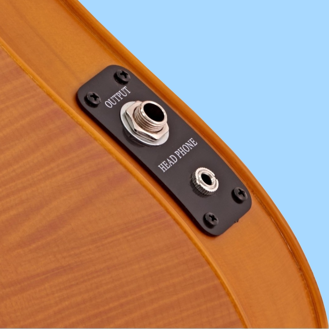 On one side of the instrument are the outputs – a 6.35mm large jack output for use with most instrument amps, and a 3.5mm mini-jack for use with headphones.