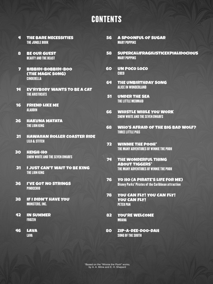Disney Fun Songs for Easy Guitar Notes & Tab brings together 26 beloved movie hits in clear, accessible arrangements designed especially for beginners. With simplified notation and easy-to-read tablature, new guitarists can enjoy playing iconic songs such as Be Our Guest, Hakuna Matata, Friend Like Me, Heigh-Ho, In Summer, Under the Sea, Winnie the Pooh, You’re Welcome and many more. Featuring 68 pages of fun, familiar music, this collection is perfect for young players, Disney fans, and anyone building confidence on the guitar while playing songs they already know and love.
