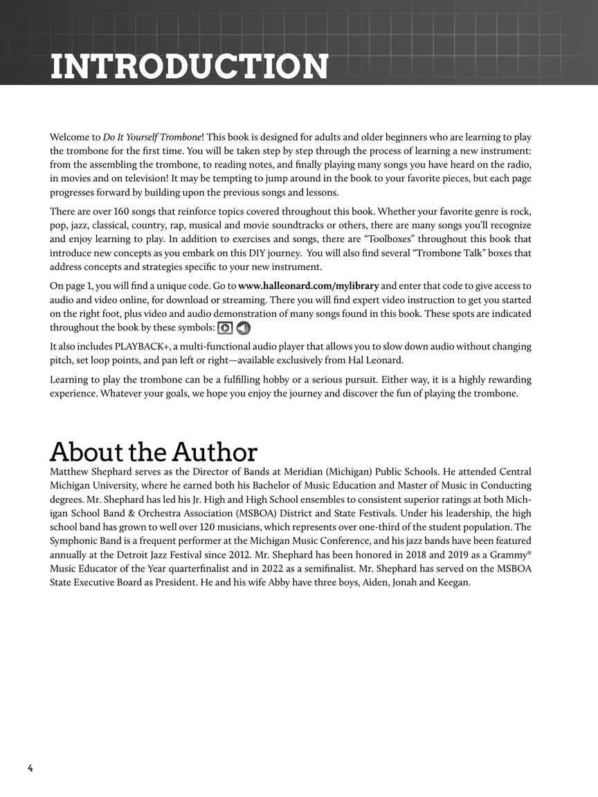 Do-It-Yourself Trombone is a fun way to get started playing on your own. Using excerpts from over 160 well-known songs from the Beatles and Disney to Elvis and Taylor Swift, you will be given step-by-step instructions on what you need to know to get started and sounding like a pro in no time. Includes audio tracks for demonstration, plus video instruction by trombone teacher Matthew Shephard.