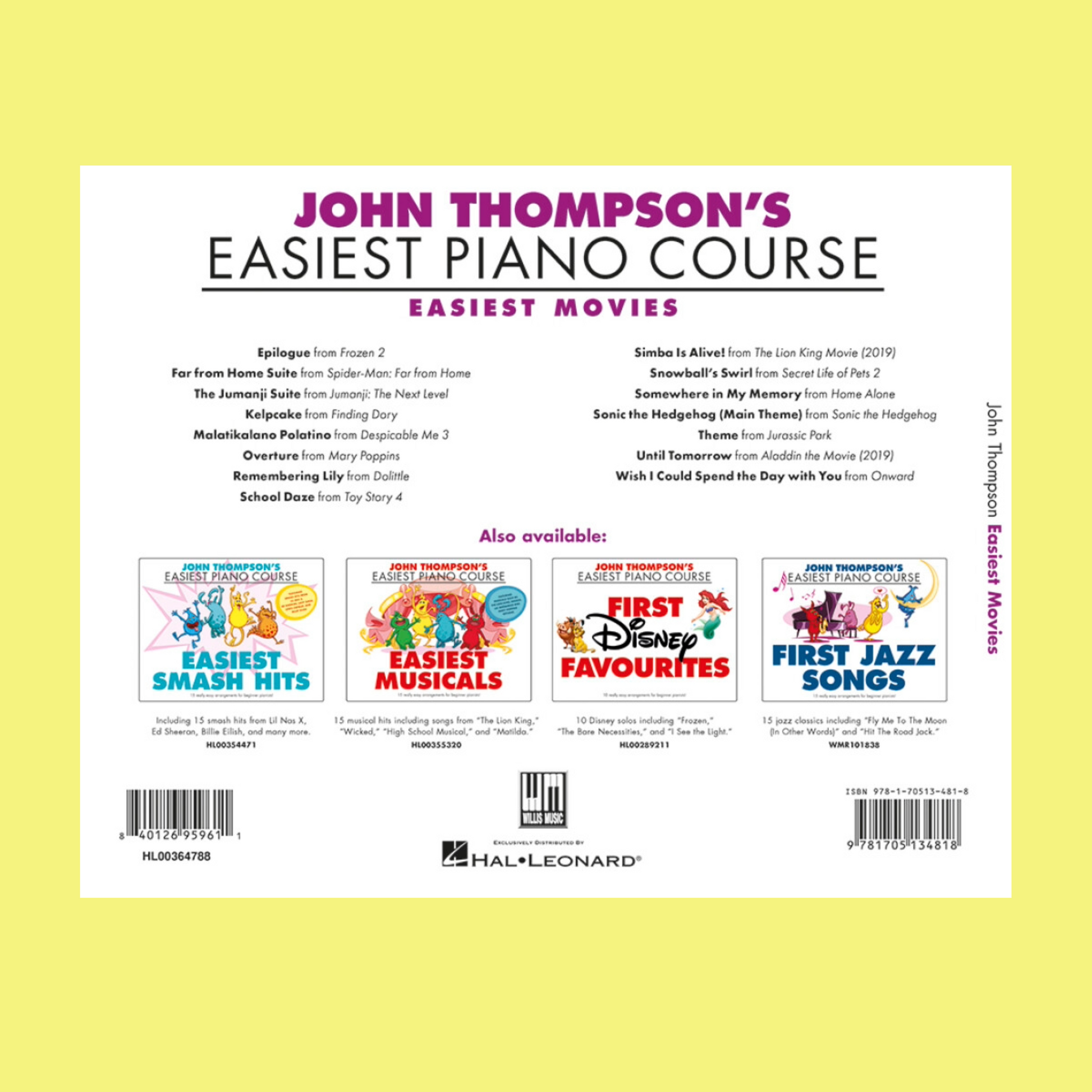 Featuring themes from popular children's movies, this book includes 15 repertoire pieces to complement the Easiest Piano Course, helping to reinforce basic technique, develop musicality and increase the enjoyment of learning. Includes music from Despicable Me 3, Jurassic Park, Toy Story 4, Home Alone, Jumanji: The Next Level, and Frozen 2.