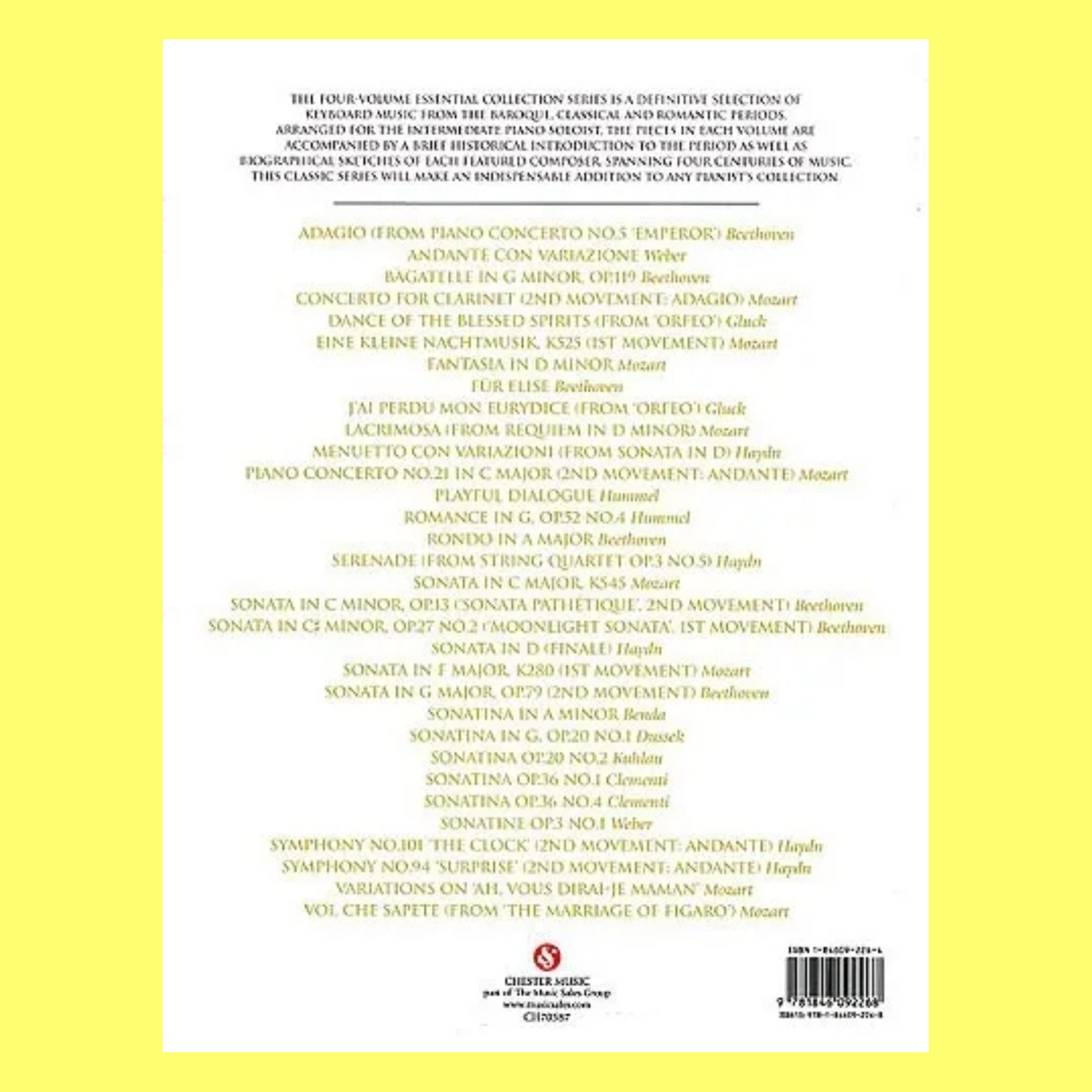 The Essential Collection - Classical Solo Piano book presents a carefully curated selection of the finest keyboard music from the classical era. Featuring works by iconic composers such as Mozart, Beethoven, and Haydn, this collection captures the essence of classical music, with its elegance, symmetry, and expressive depth.