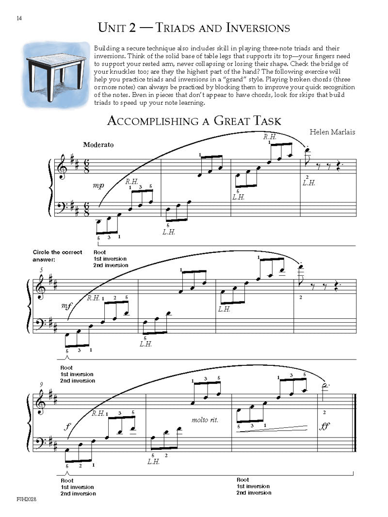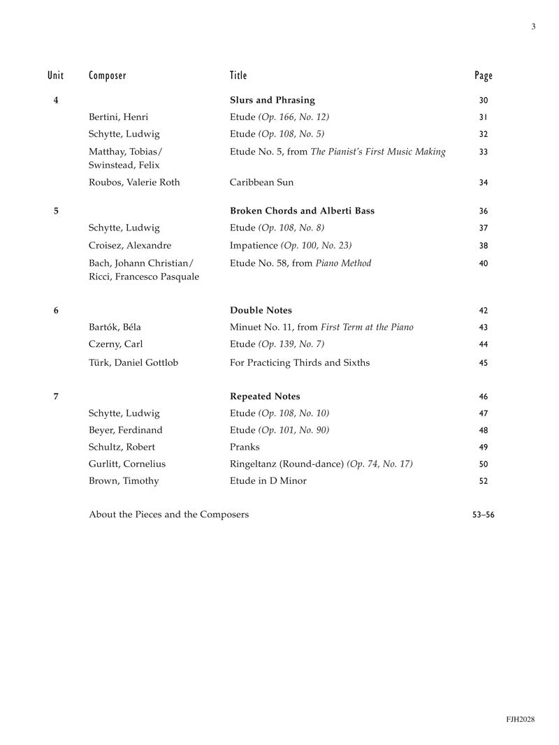 This 56-page book presents new techniques and expands on previous ones such as Five Finger Patterns and Extensions, Scale Preparation and Octave Scales, Slurs and Phrasing, Broken Chords and Alberti Bass, Double Notes, and Repeated Notes.