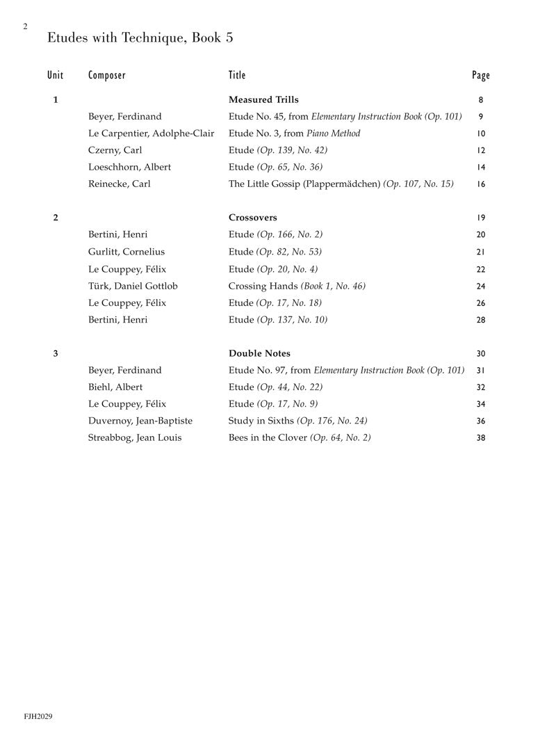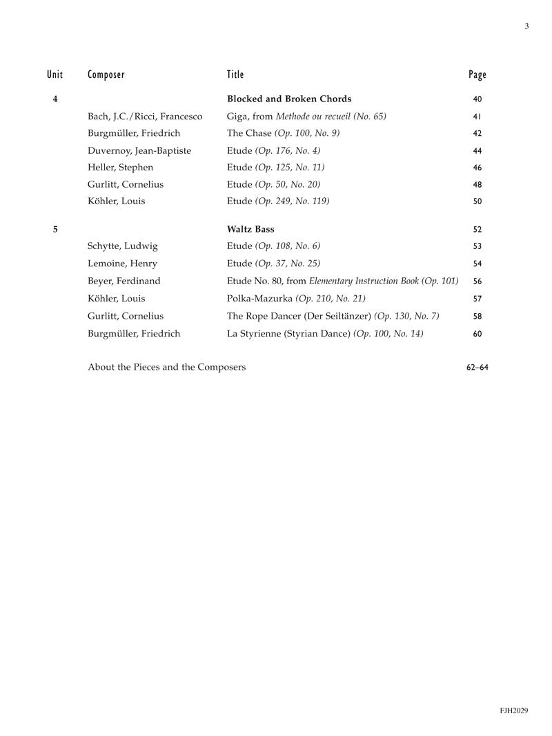 Unit 1 focuses on Trills; Unit - Crossovers; Unit - Double Notes; Unit - Blocked and Broken Chords; and Unit - Waltz Bass.