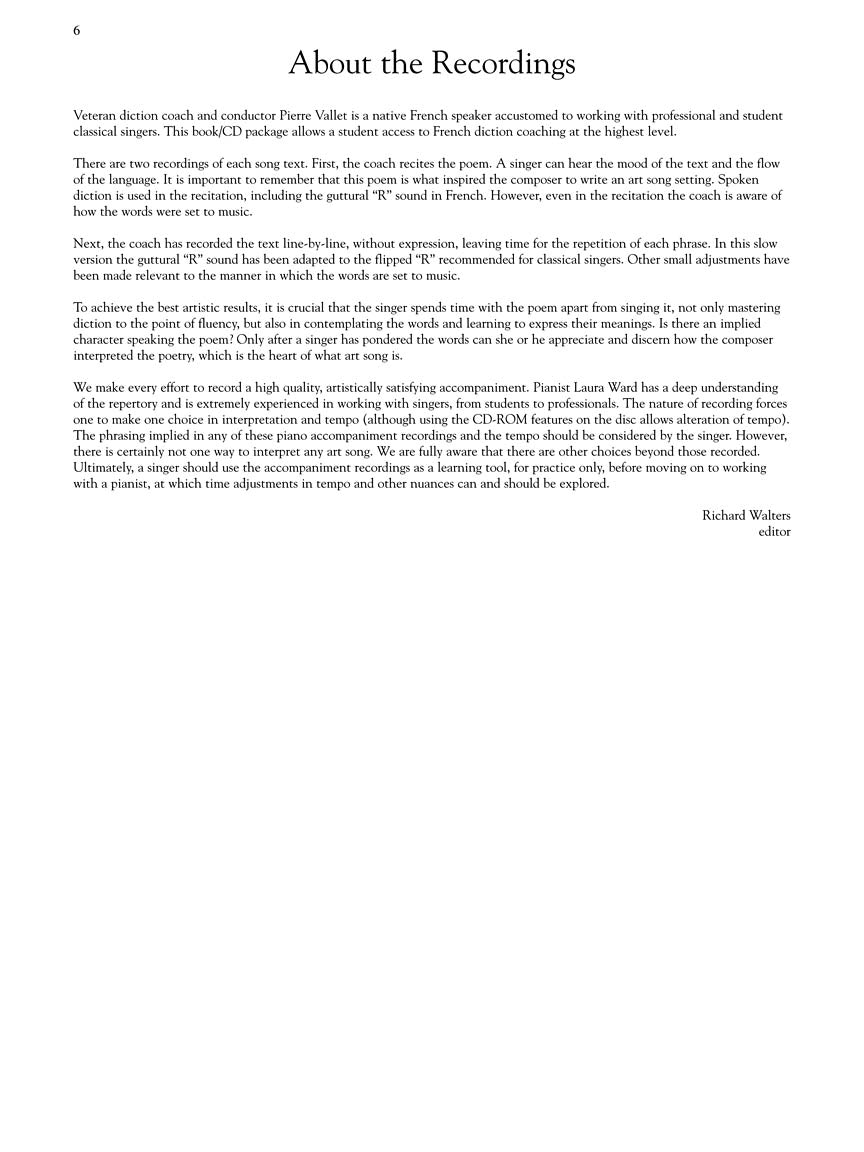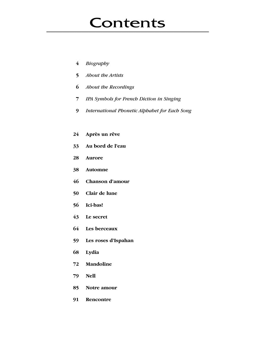 Online audio features expert diction coaching by Pierre Vallet, with each song recited naturally and then broken down slowly for precise vocal study—ideal for classical singers aiming for authentic French delivery.