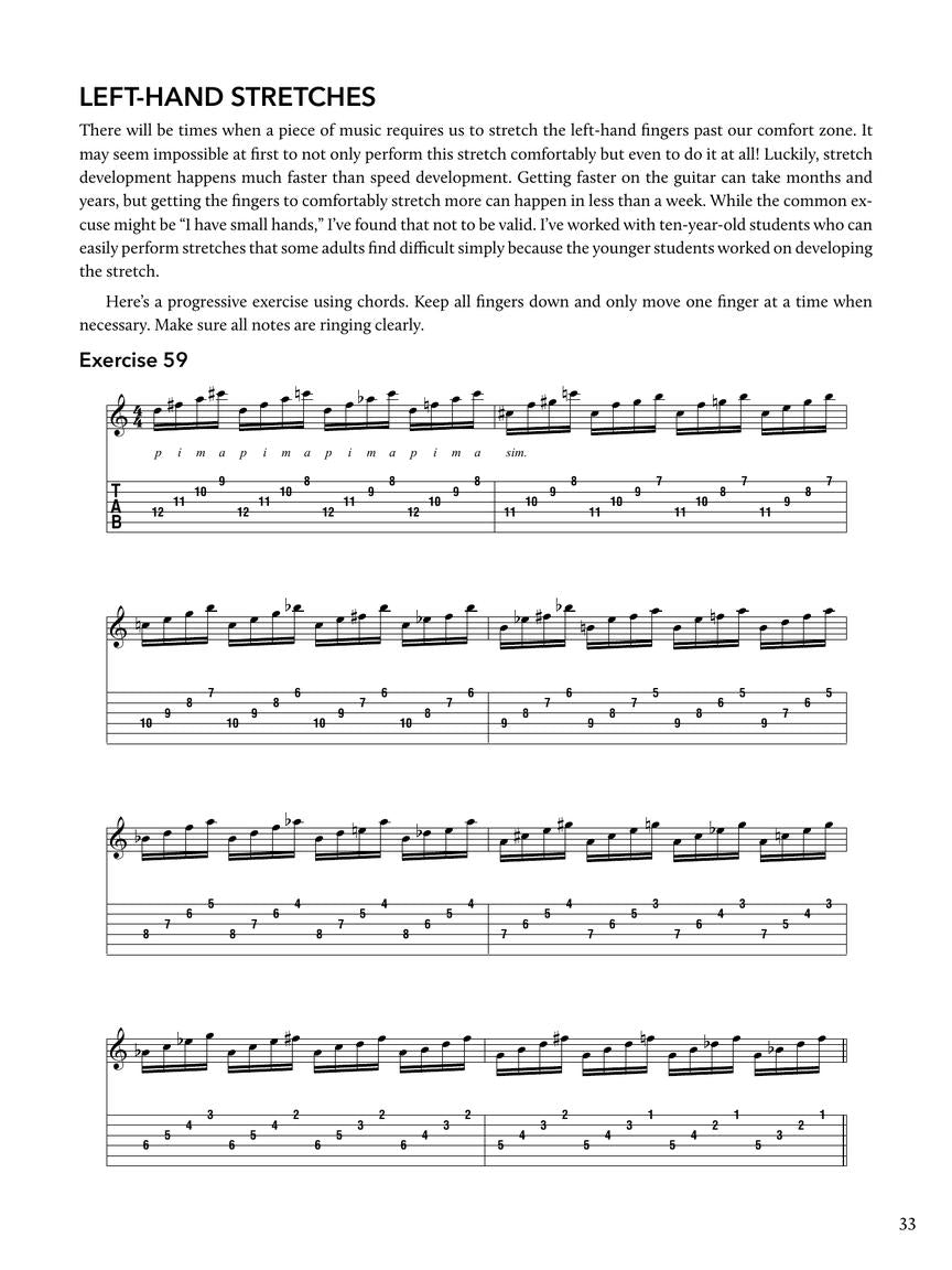 The workouts in this book cover a wide range of topics, including right-hand dexterity, speed, useful pima patterns, left-hand stretches, finger independence, legato techniques, barre techniques, Travis picking, arpeggios, scales, and much more. Each lesson is thoughtfully crafted to provide you with the tools and knowledge needed to elevate your fingerstyle guitar playing.