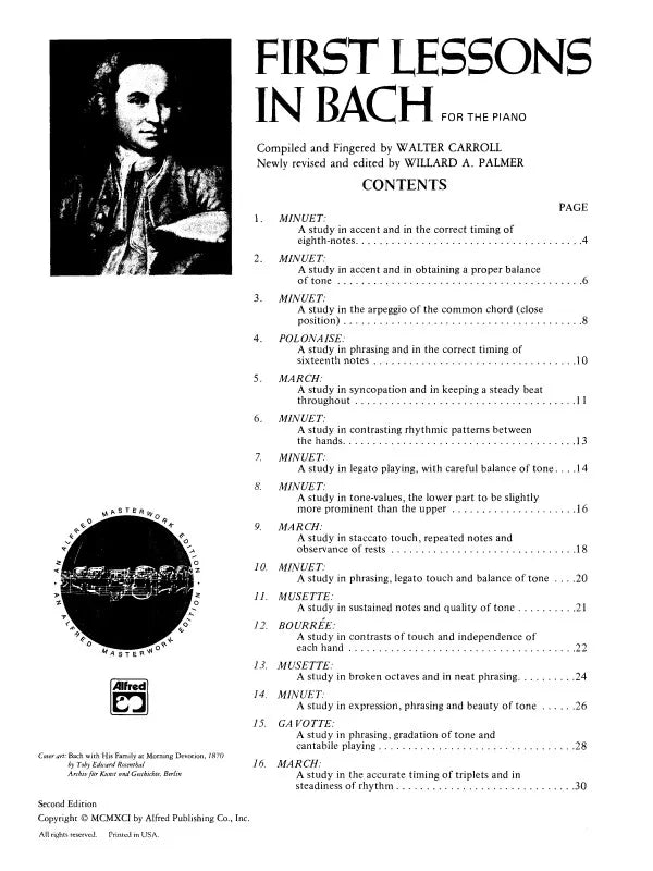Willard A. Palmer brings new life to this popular collection by British educator Walter Carroll. This volume features the easiest keyboard works of J.S. Bach and others, presented with complete fingering, tempo, dynamic, and articulation markings. Enhancements include wider line spacing and the restoration of Bach's original ornaments that were previously omitted. Ideal for beginner to intermediate pianists. 32 pages.
