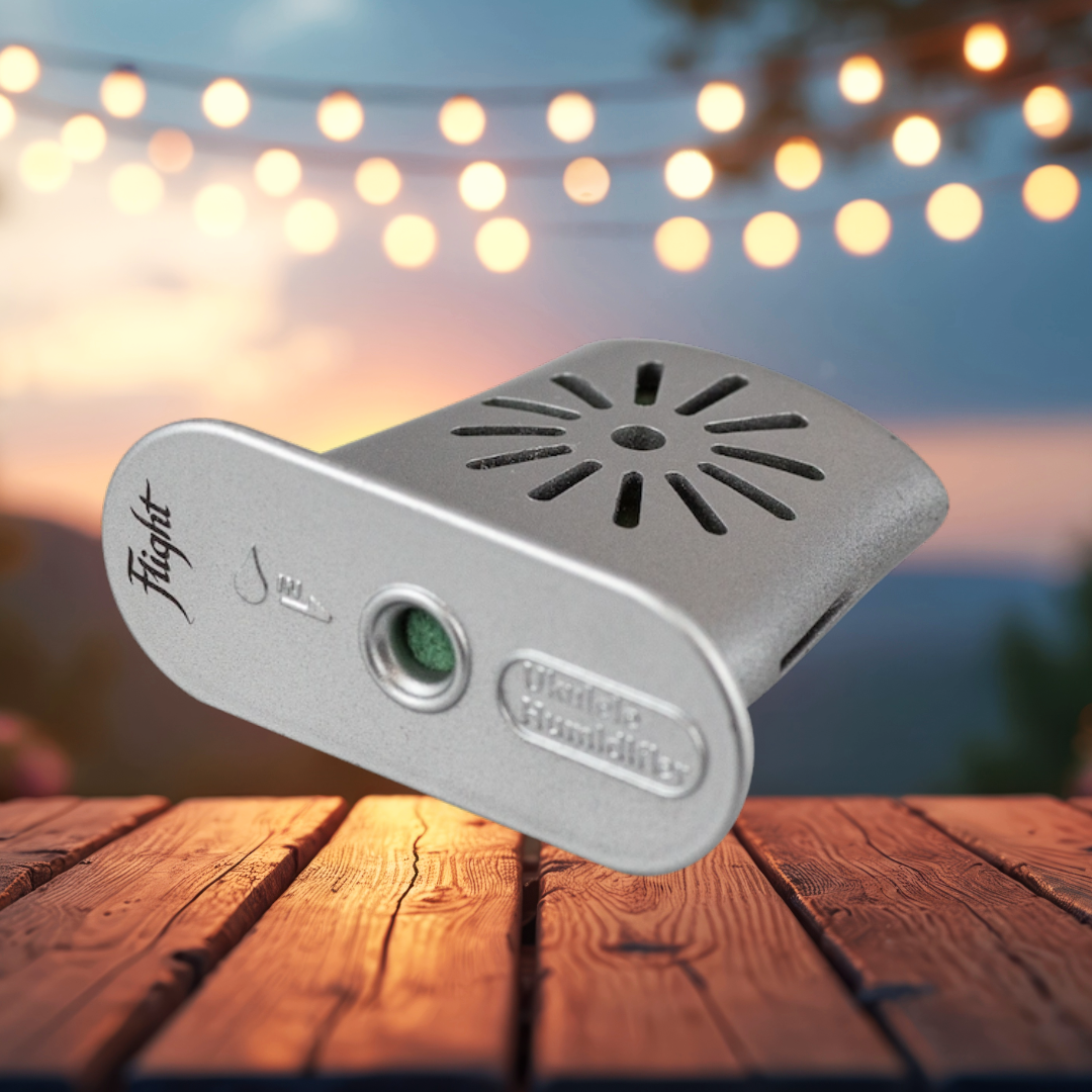 If you live in an area with low humidity, the wood of any instrument can dry and warp, causing issues with playability, such as fret buzz and dead string sounds. This isn’t a design fault; it’s how wood behaves naturally. We love the instruments we make, and we want you to continue enjoying them. Our Flight Navigator, as well as the Royal Series, comes with a Flight Ukulele Humidifier included.