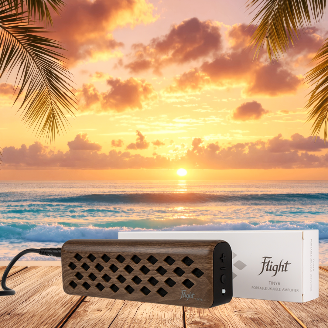 Say, “Hello,” to the Flight Tiny 6 Ukulele Amplifier, a fantastic piece of kit for any player with an electro-acoustic or a solid body electric ukulele.  This lithium battery powered six-watt wonder fits comfortably in day packs or the front pocket of most Flight gig bags.