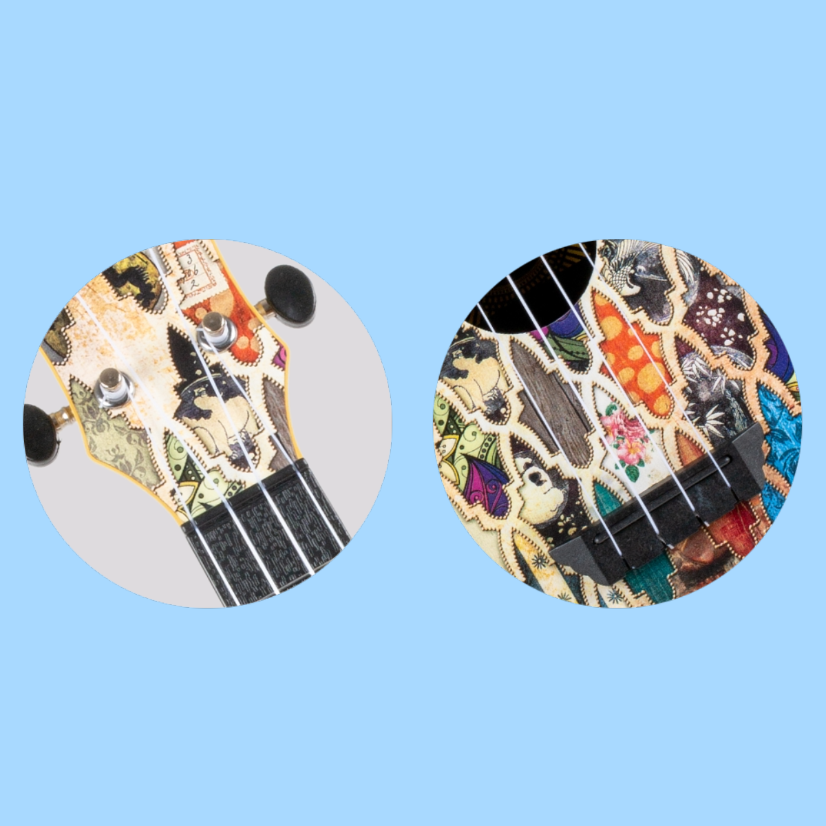 - Premium Features: Granada Print, Zero Fret, Wooden Top, Arched back, Open Geared Tuners, ABS Fretboard, Side Dots, Strap Button, Aquila Sugar Strings