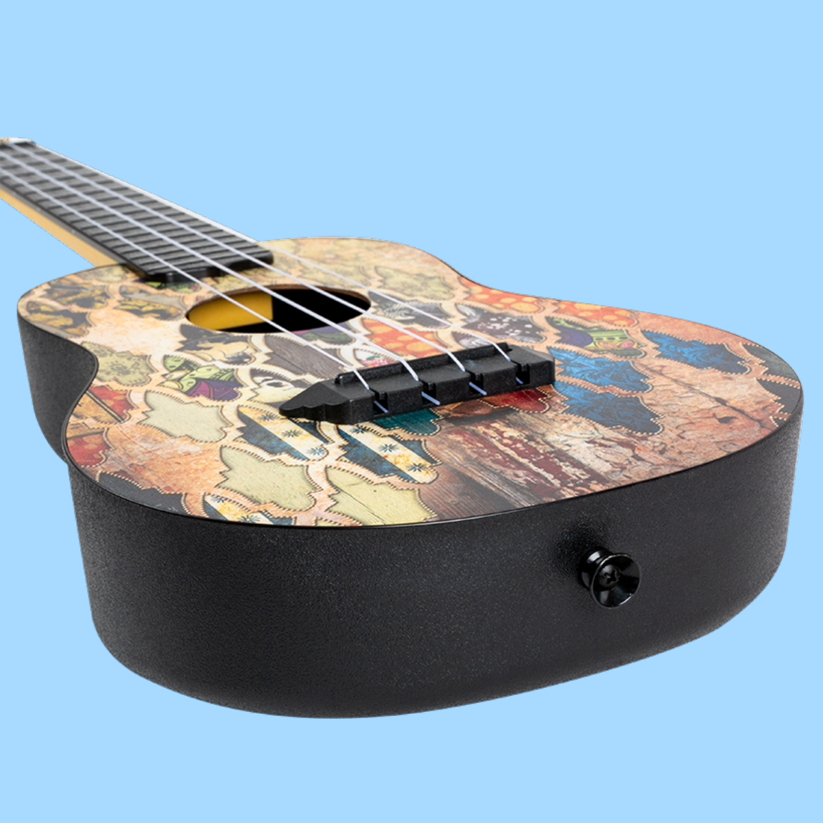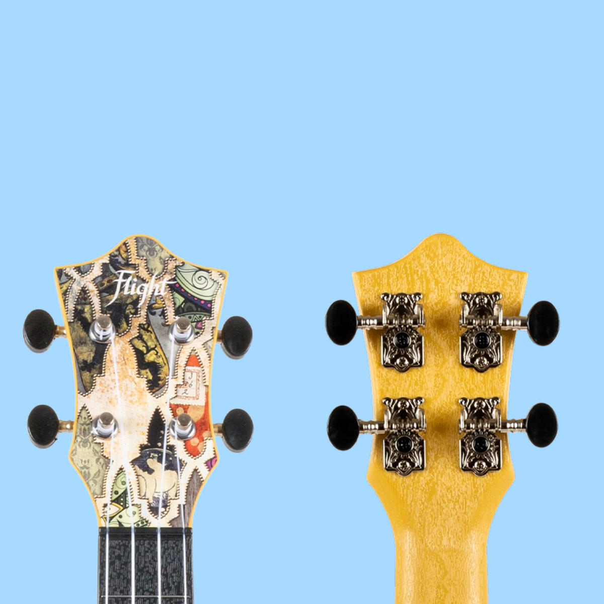 All Flight ukuleles feature a meticulously designed headstock with geared tuners, making tuning a breeze. The headstock veneer is constructed from linden wood, matching the soundboard for a harmonious visual appeal. The Travel Ukulele Series also includes a lightweight gig bag to facilitate easy transportation and safeguard the strings during travel. With the Flight TUC-40 Granada Print Travel Concert Ukulele, you're equipped with an instrument that marries impeccable sound, playability, and durability, making it an ideal choice for musicians on the go.