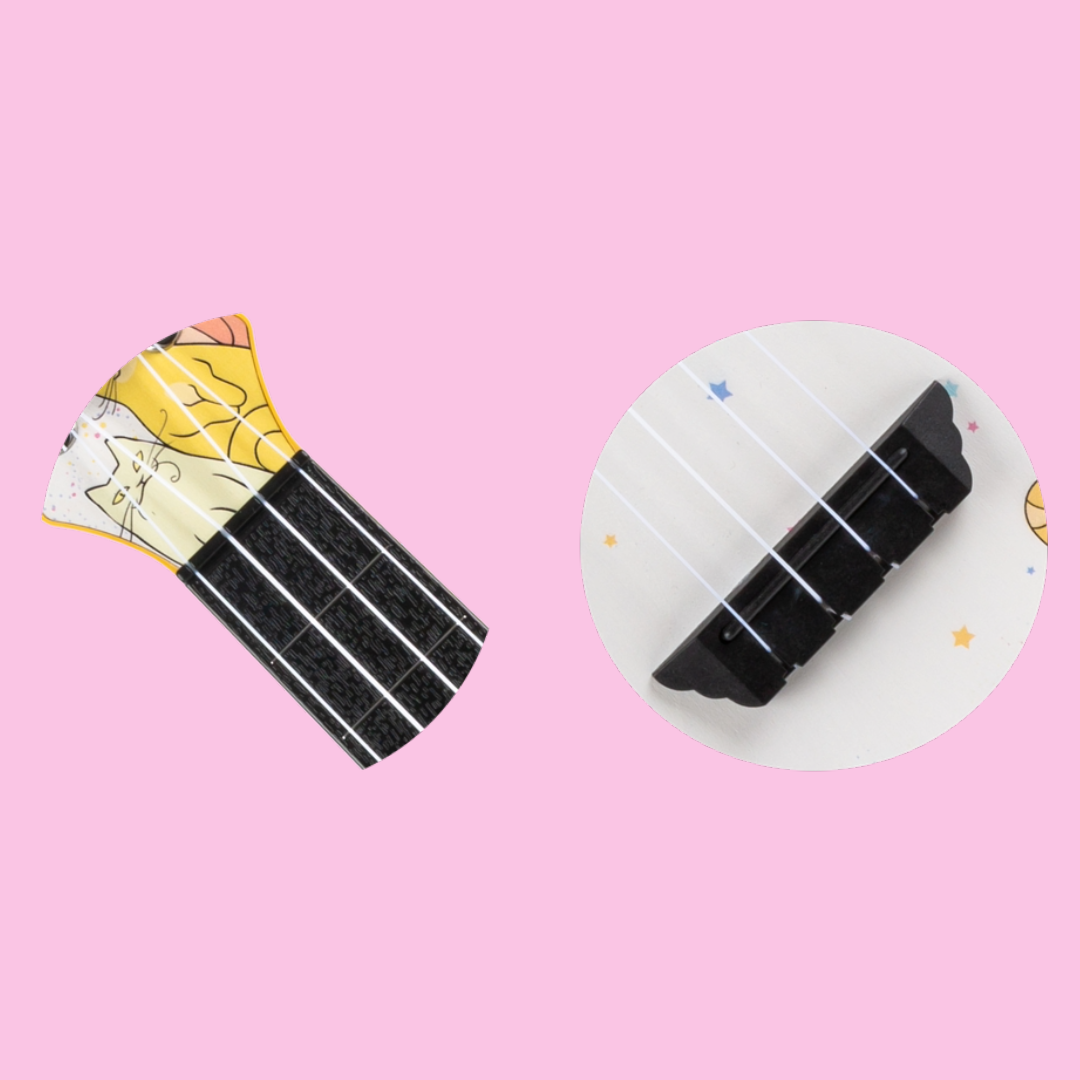 Crafted with a linden wood top and a sturdy ABS body, neck, fretboard, and bridge, this ukulele is as tough as a cat on the prowl. It's not just about looks; it delivers a bright and punchy sound, ensuring your melodies will be music to your ears.