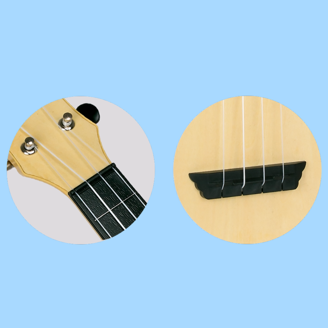 The neck and fingerboard of this ukulele are crafted from ABS plastic, a choice that ensures both durability and a consistent playing experience. Unlike traditional wood ukuleles, the ABS plastic remains unaffected by weather changes, ensuring that your ukulele's frets remain smooth and comfortable. The wooden texture of the neck adds a touch of familiarity, creating a tactile connection that enhances your playing pleasure.