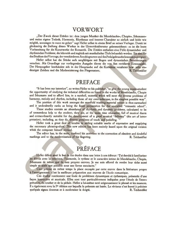 24 Melodious Studies Op. 125 by Stephen Heller, edited by Robert Teichmuller, is a beautifully crafted collection of studies designed to help pianists improve their technique and musical expression. Heller’s attention to detail in adding expressive marks, phrasing, and slurs allows for a rich performance of each study. This edition is based entirely on the composer’s original version, which he revised himself, ensuring an authentic and high-quality resource for pianists.