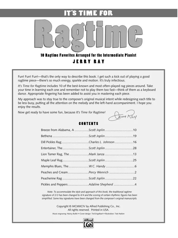 This collection of 10 ragtime favourites, arranged by Jerry Ray, is perfect for intermediate-level pianists. 'It's Time for Ragtime' features well-known pieces like "The Lion Tamer Rag," "The Memphis Blues," and "Maple Leaf Rag," all staying true to the composers' original intent while remaining accessible for developing pianists.