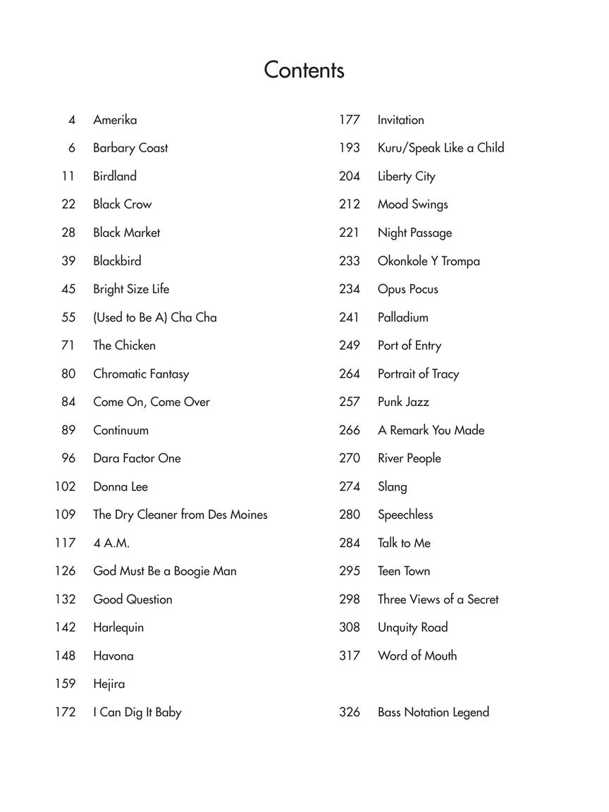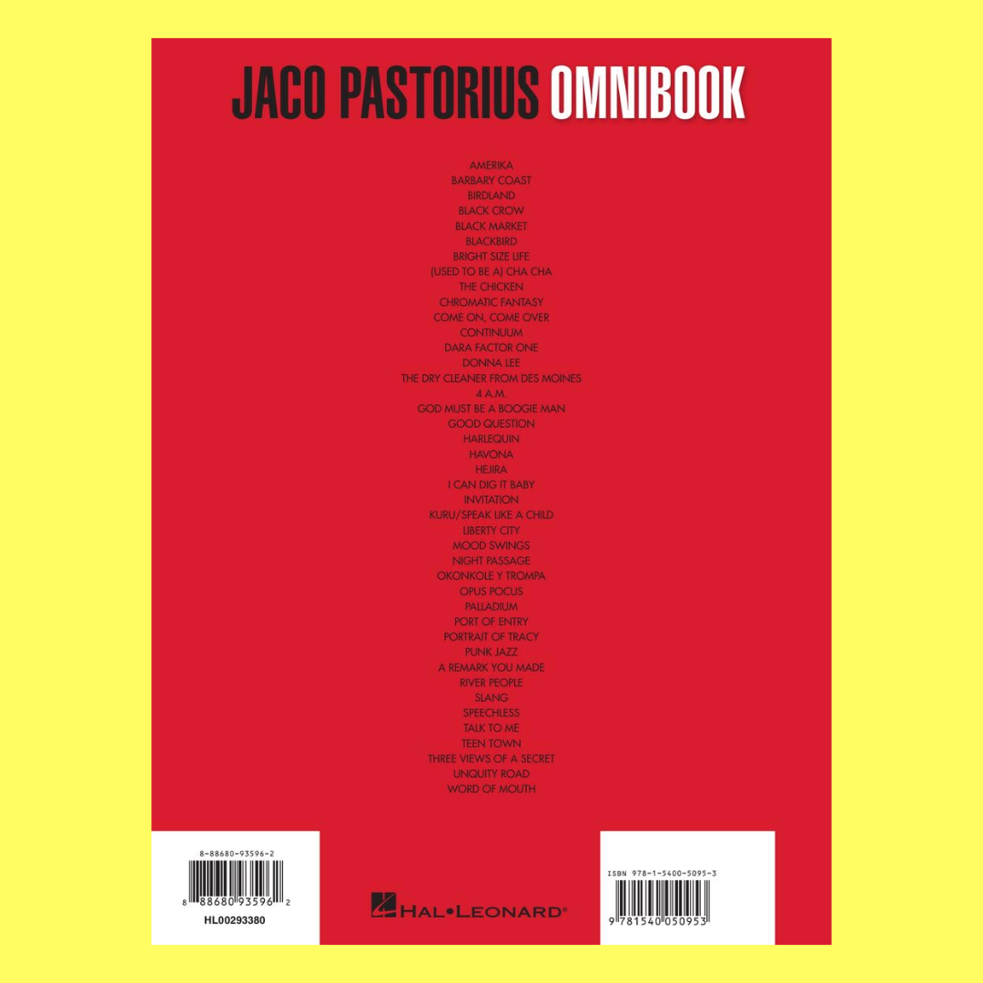 Containing 43 works, including classics like "Amerika," "Barbary Coast," "Birdland," "Black Crow," "Black Market," "Blackbird," and more, this omnibook is a must-have for any bass player's library. Each transcription is meticulously crafted to capture the essence of Jaco's playing style, allowing musicians to delve into his iconic bass lines and techniques.