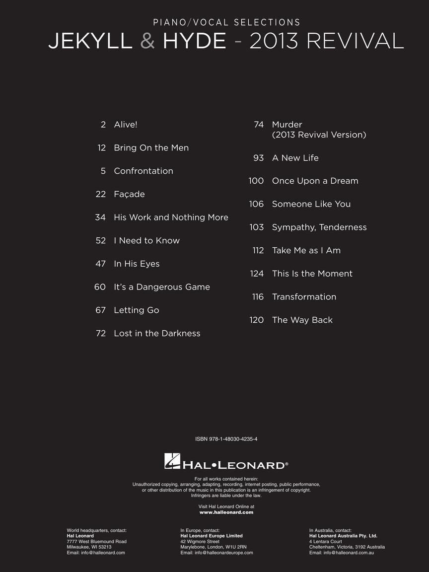 Explore other captivating tracks such as "Alive!", "Bring on the Men", "Confrontation", "Facade", "In His Eyes", "Letting Go", "Murder", "A New Life", "Once Upon a Dream", "The Way Back", and many more. This 128-page songbook captures the musical magic and drama of the dual nature of man, perfect for fans and performers alike.