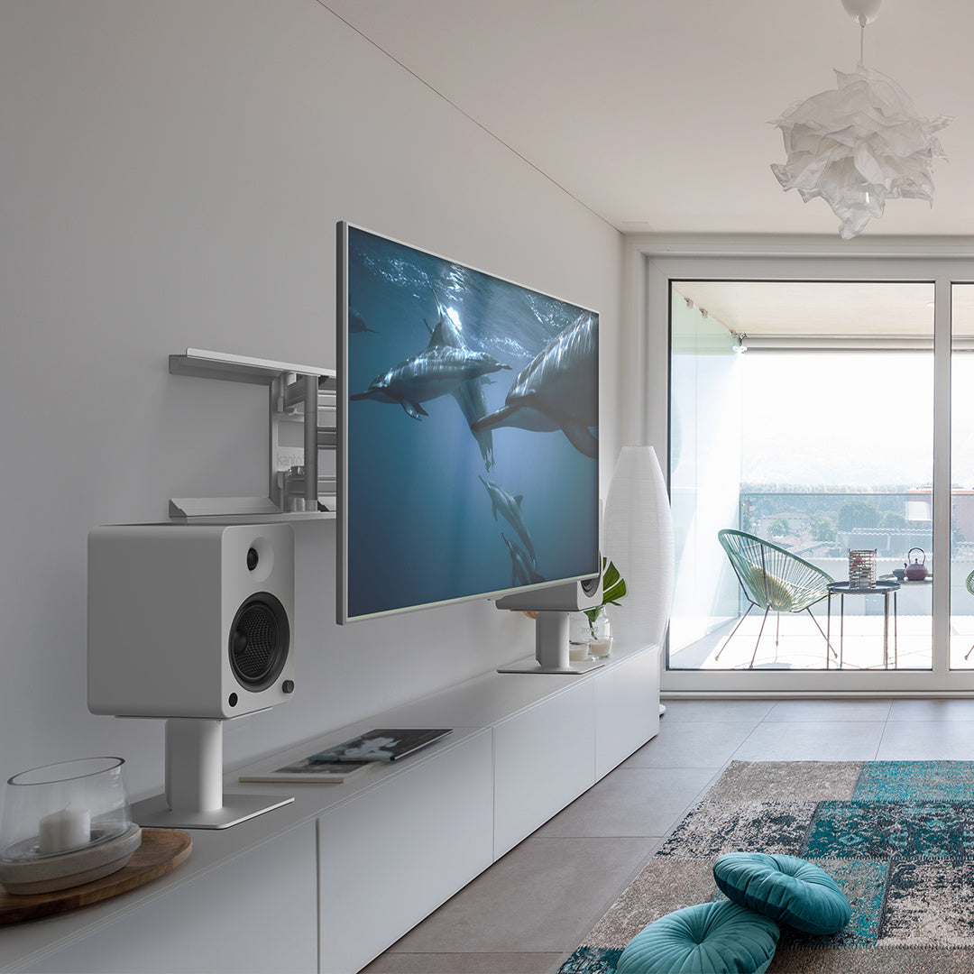 Kanto SP6HDW 6" Tall Universal Desktop Speaker Stand - Pair, White - Measuring 6-inches tall, SP6HD desktop speaker stands bring your YU4, YU6, TUK or other 4 to 7-inch speakers into better alignment with your ears, letting you capture a wider range of frequencies. Their heavy steel structure and closed cell foam padding further improve nearfield listening by significantly reducing vibration, leaving you with cleaner, more accurate sound. Two top-plate sizes are included, each providing 30 degrees of rotation and featuring a mounting hole and 1/4” – 20 screw to secure compatible speakers in place. For a clutter-free setup, conveniently route your cables through the centre of each stand.