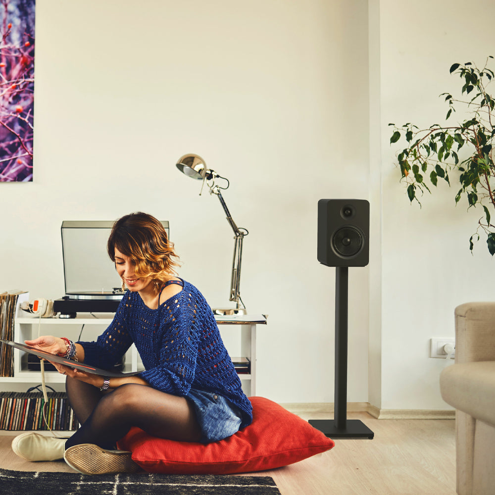 Kanto ST28 28" Universal Bookshelf Speaker Floor Stands – Black, Pair-Get the most out of your speakers by placing them at ear level and away from surfaces that can cause unwanted sound reflections. The Kanto ST28 and ST34 floor speaker stands are purpose-built for bookshelf and standmount speakers weighing up to 13.6 kg (30 lbs). Constructed with durable steel columns and a weighted MDF base, they offer reliable stability and improved acoustic performance.