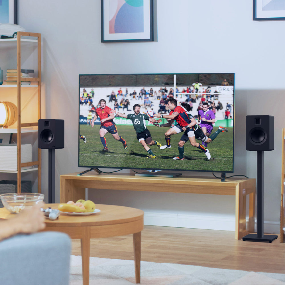These stands come with adjustable rubber feet for hard floors and carpet spikes for secure positioning on carpet. An integrated cable management system keeps cords neat and tucked away, helping maintain a clean, clutter-free look. With a sleek and timeless black finish, ST-series stands fit seamlessly into any Aussie home setup. Sold as a pair and available in both 28” (71 cm) and 34” (86 cm) heights.