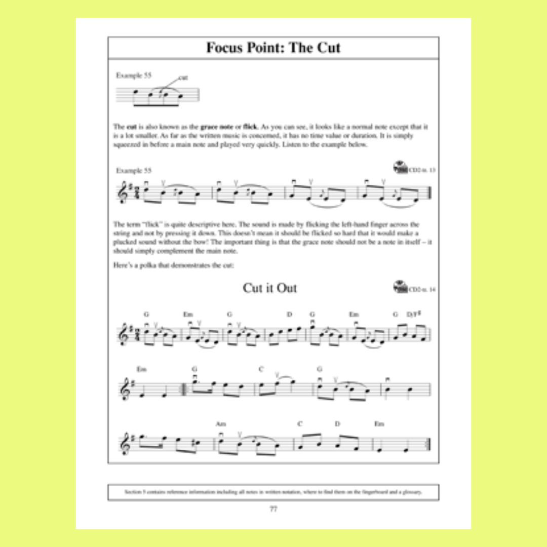 Throughout the book, learners will be introduced to essential embellishments and techniques characteristic of Irish fiddle playing, including rolls, cuts, triplets, and slides. These elements are introduced gradually, allowing students to build their skills and develop a solid foundation in the Irish fiddling tradition.