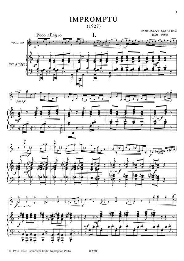 The impromptu showcases Martinu’s daring use of bitonal chords, pitting a more diatonic violin part against a richly dissonant piano accompaniment. This piece stands out as Martinu's first effort to make modern music more accessible to beginning musicians, offering them an engaging introduction to contemporary sounds.