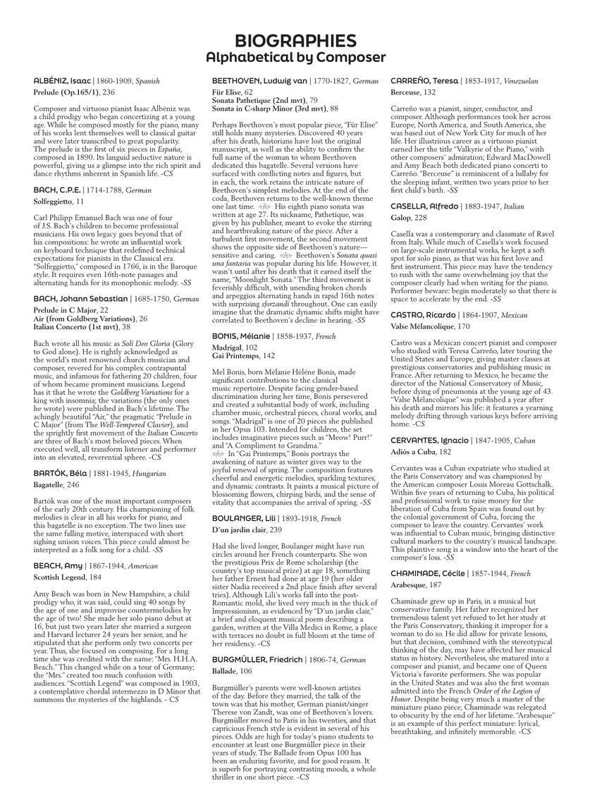 Delve into an extensive array of original piano solos, carefully curated to juxtapose familiar masterpieces with lesser-known gems. Experience the brilliance of Chopin's compositions alongside delightful pieces by lesser-known composers such as Melanie Bonis and Ignacio Cervantes. Brief composer biographies accompany each piece, providing insight into the lives and inspirations behind the music.