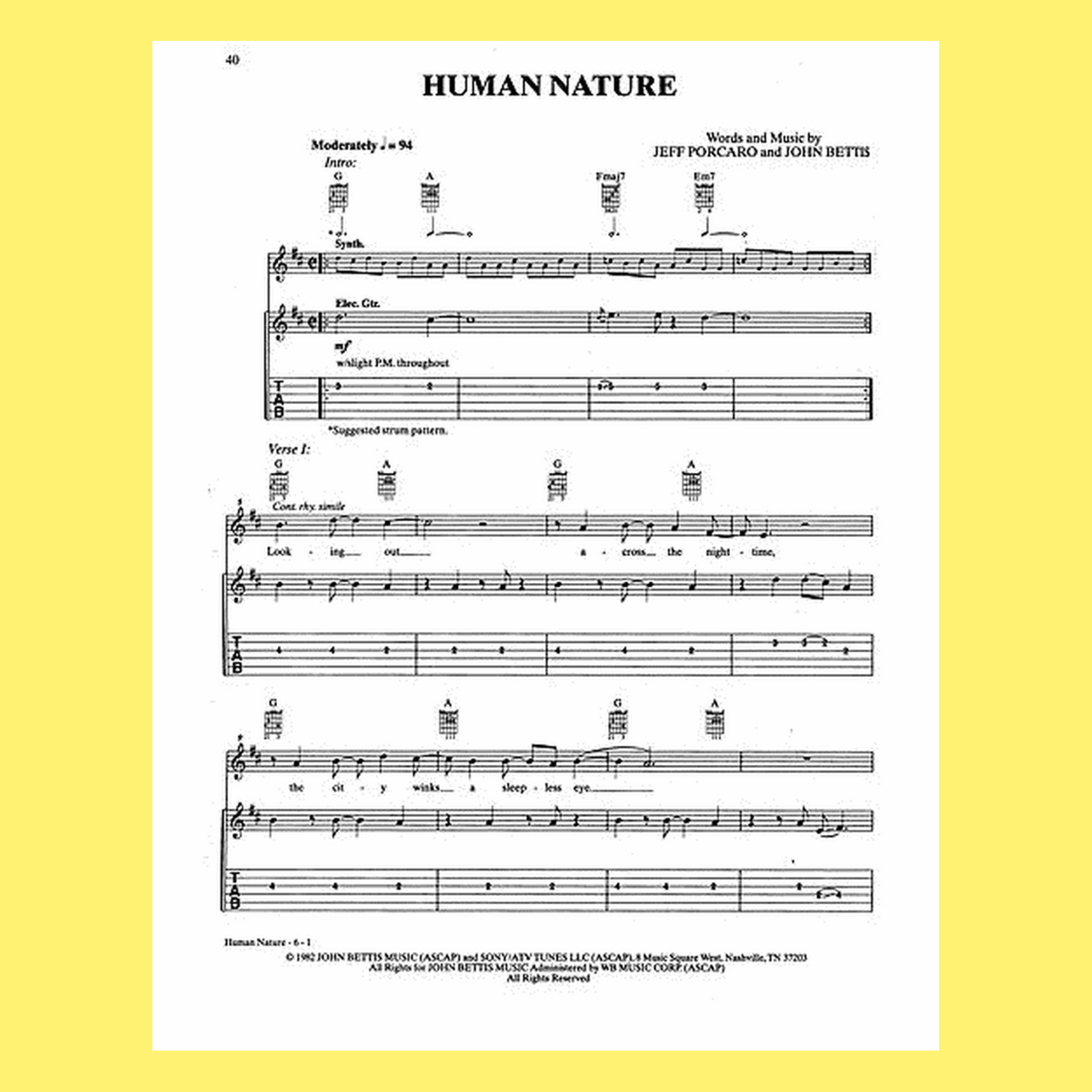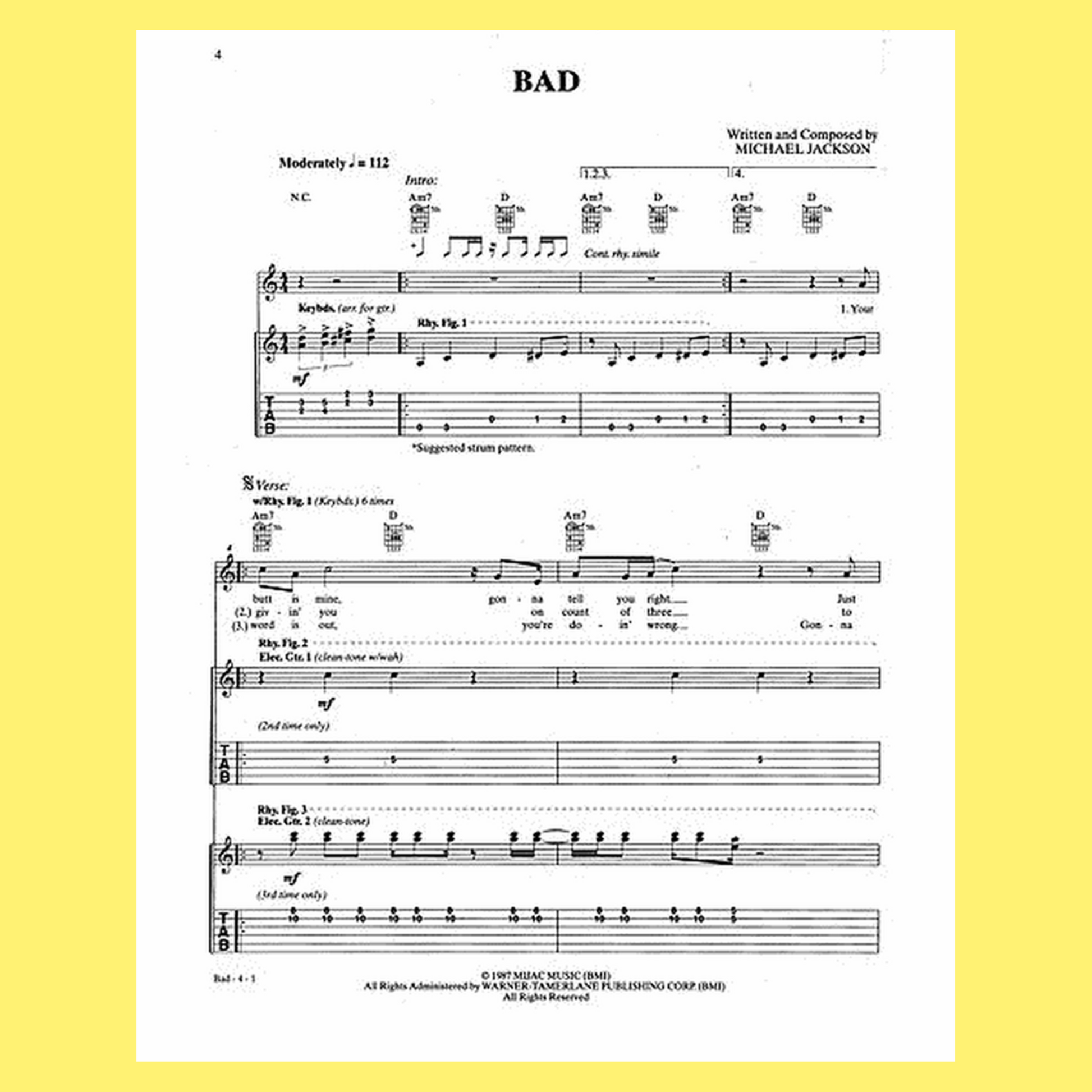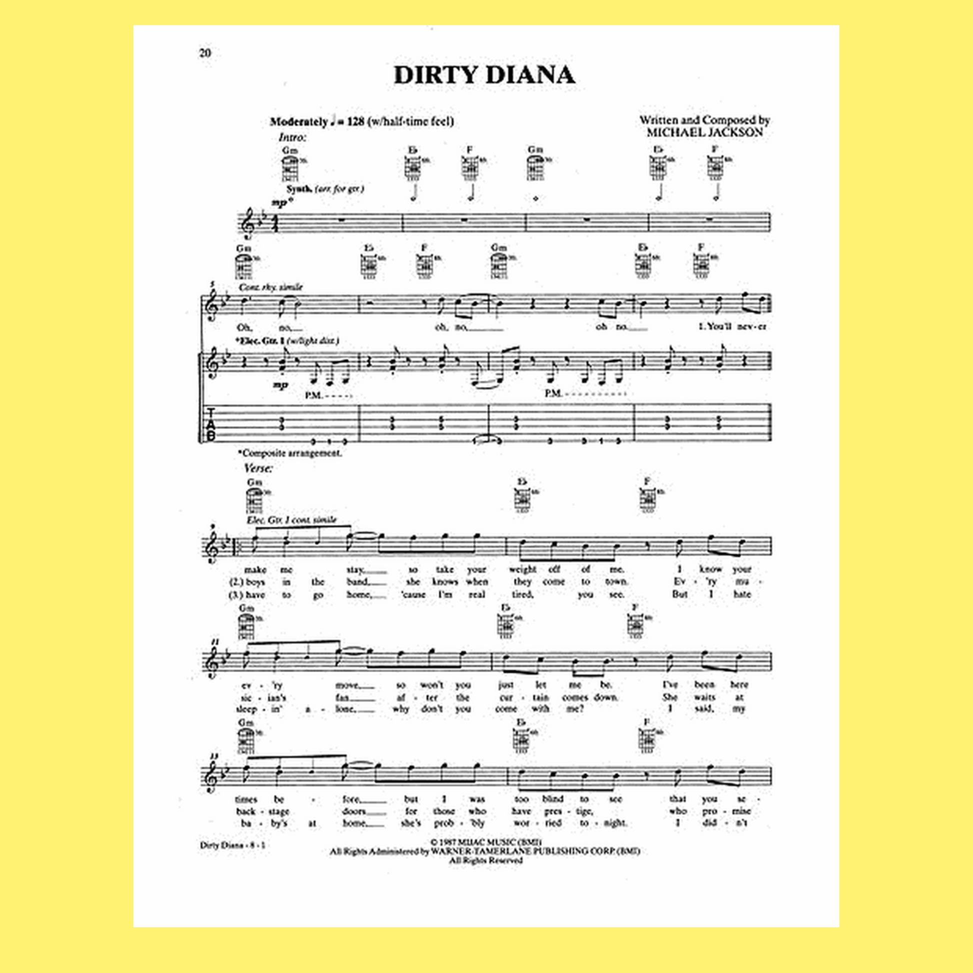 Included in this collection are classics such as "Beat It," "Billie Jean," "Rock with You," "Thriller," "Smooth Criminal," "Wanna Be Startin' Something," and many more. Spanning 104 pages, this guitar tab songbook offers detailed transcriptions that allow guitarists to faithfully recreate the music of one of pop's most influential artists.