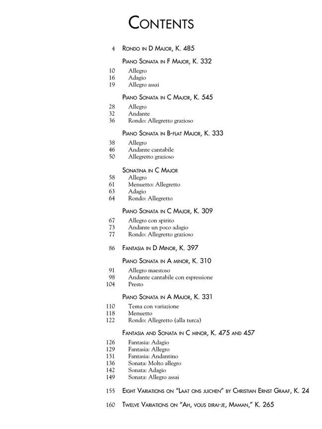 This collection features 12 well-known piano works by Wolfgang Amadeus Mozart, including some of his most frequently performed sonatas. With 168 pages of carefully selected music, this book offers a great introduction to Mozart's piano repertoire, making it an essential addition for pianists looking to explore the timeless classics of this renowned composer.