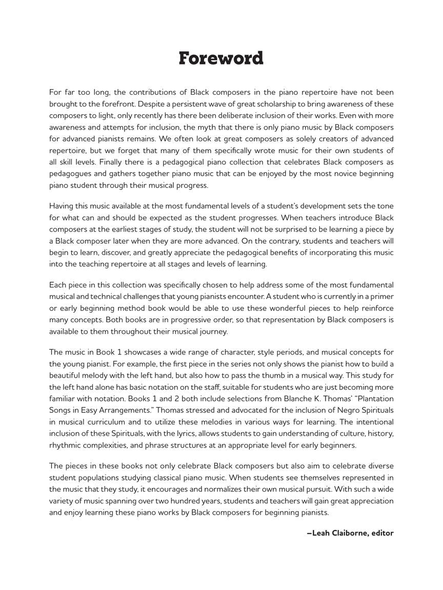 This volume is thoughtfully curated to present music by Black composers in a progressive order, ensuring a gradual and engaging learning experience for students. Additionally, the book includes pedagogical notes provided by Leah Claiborne, an expert in the field, to enhance the understanding and interpretation of the featured compositions. With 32 pages of music, this book opens up new avenues for students to discover and appreciate the contributions of Black composers to the world of piano music.