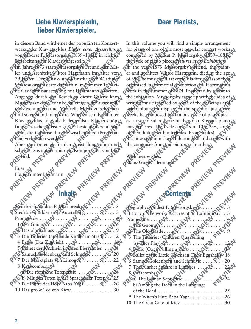 "Get to know classical masterpieces": Within this series you will find a simple arrangement for piano of one of the most popular concert works composed by Modest P. Mussorgsky , the cycle of piano pieces Pictures at an Exhibition. With explanatory texts and fully coloured illustrations, the edition is aimed at young and adult pianists. The easily playable arrangements and original pieces provide an ideal introduction to this work.