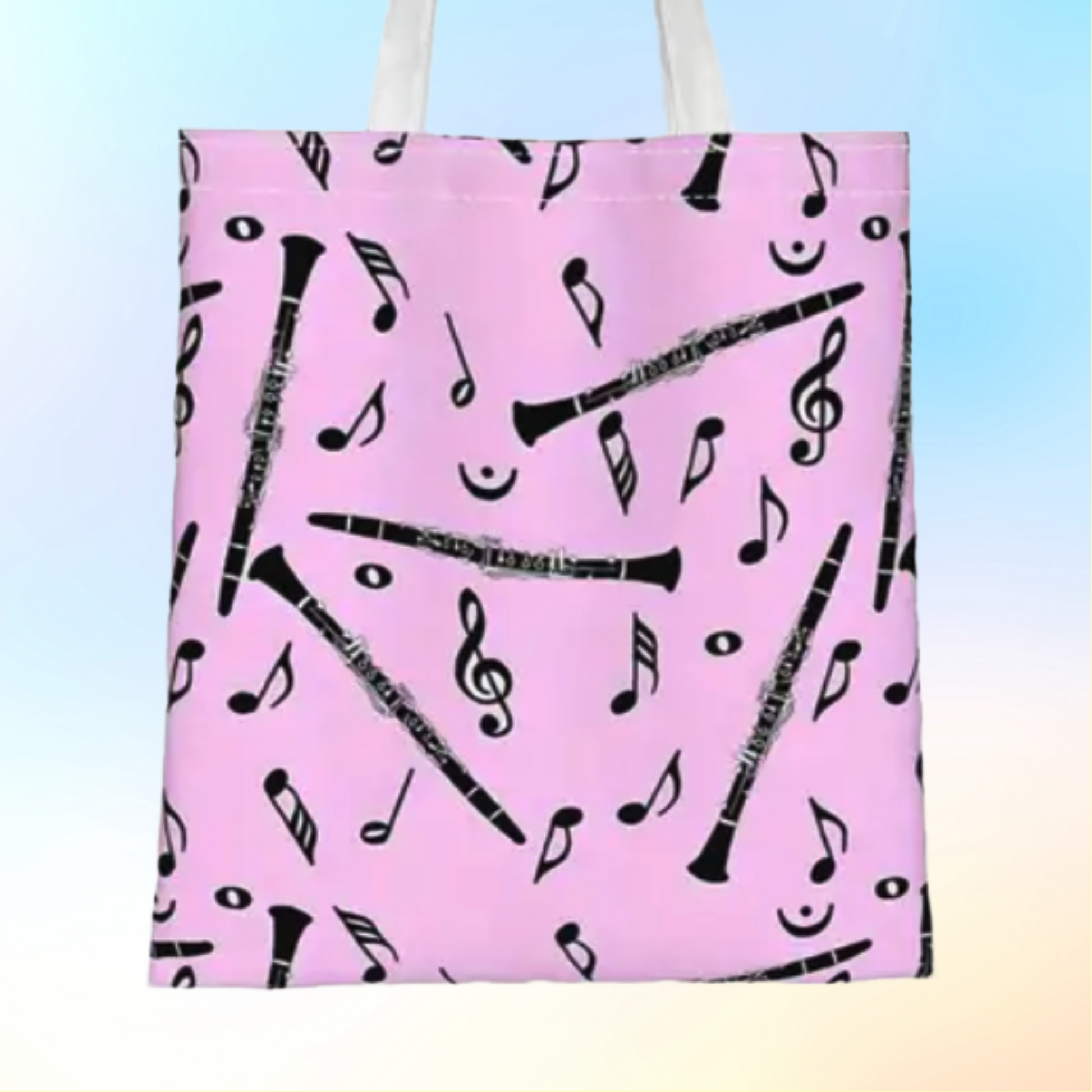 Carry your music in style with this eye-catching pink cotton tote. Featuring bold black clarinets and treble clef music notes, this bag is perfect for lessons, rehearsals, or everyday use. Its 38cm x 34cm size makes it just right for sheet music, books, and accessories, while the sturdy white handles ensure comfort and durability.
