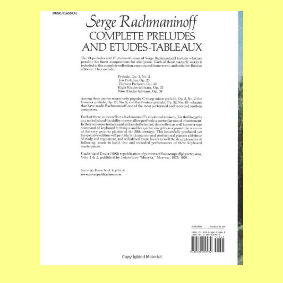 The 'Serge Rachmaninoff: Complete Preludes & Etudes-Tableaux' book features 24 preludes and 17 etudes-tableaux, some of Rachmaninoff's most celebrated works for solo piano. It includes iconic pieces like the 'Prelude in C-sharp minor, Op. 3, No. 2,' the 'G-minor prelude, Op. 23, No. 5,' and the 'B-minor prelude, Op. 32, No. 10.' All compositions are reproduced from authoritative Russian editions, offering pianists an authentic and detailed resource. 224 pages.