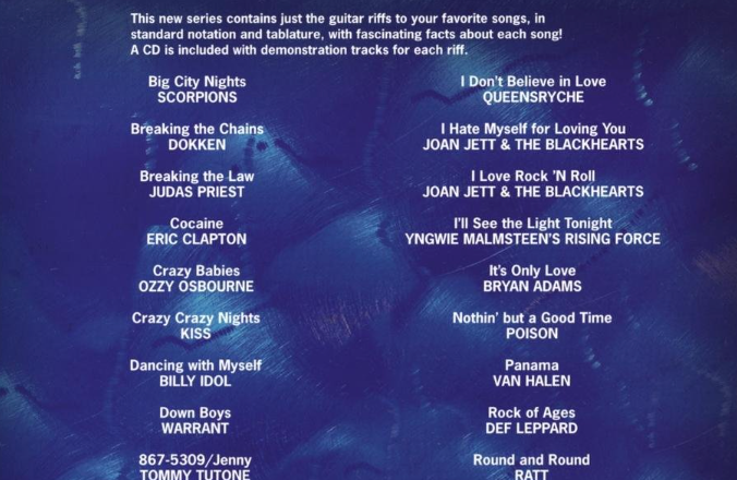 The book includes riffs from iconic songs such as Dancing with Myself, 867-5309/Jenny, Every Breath You Take, Eye of the Tiger, Hurts So Good, I Love Rock n Roll, Panama, What I Like About You, You Give Love a Bad Name, and many more. Each song is accompanied by fascinating facts and insights, giving you a deeper understanding of the music and the era.
