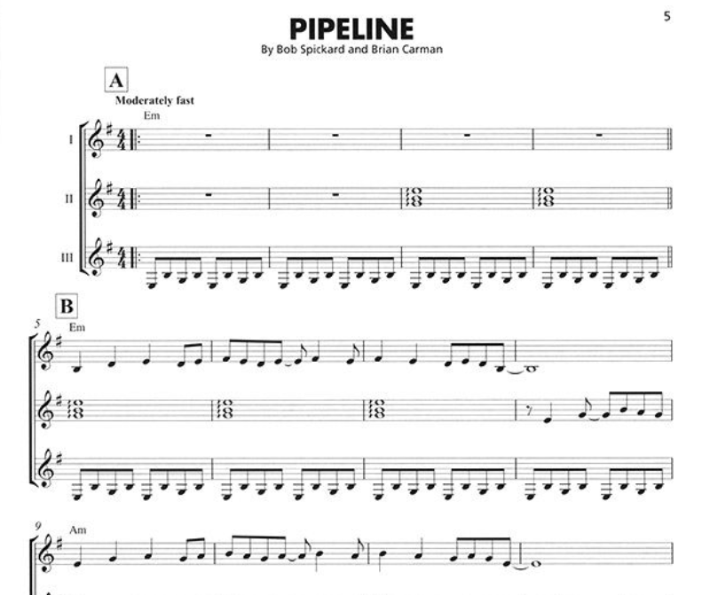 The songs in Hal Leonard's Essential Elements Guitar Ensembles series are playable by multiple guitars. Each arrangement features the melody (lead), a harmony part, and a bass line. Chord symbols are also provided if you wish to add a rhythm part. For groups with more than three or four guitars, the parts may be doubled. Play all of the parts together, or record some of the parts and play the remaining part along with the recording.